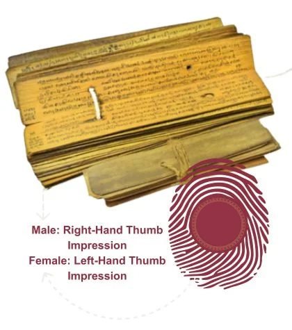 Your unique thumb impression is used to locate the specific palm leaf bundle that belongs to you. Men use the right thumb and women use the left thumb.